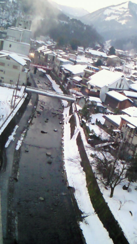 をまとった、山間の温泉街