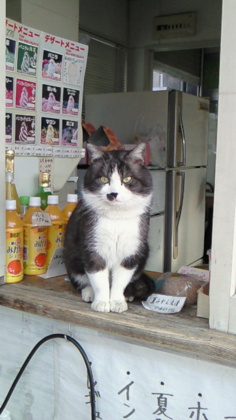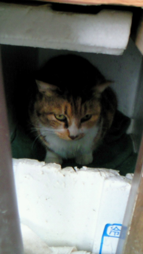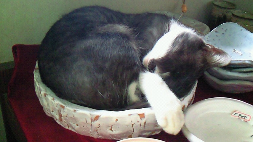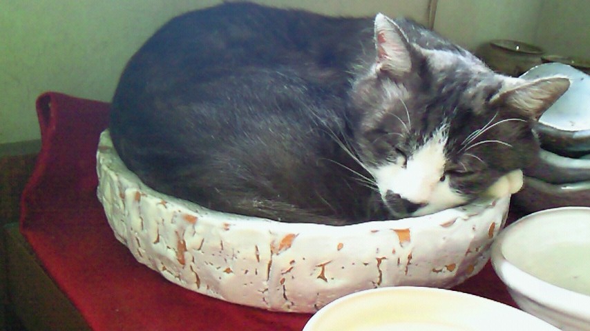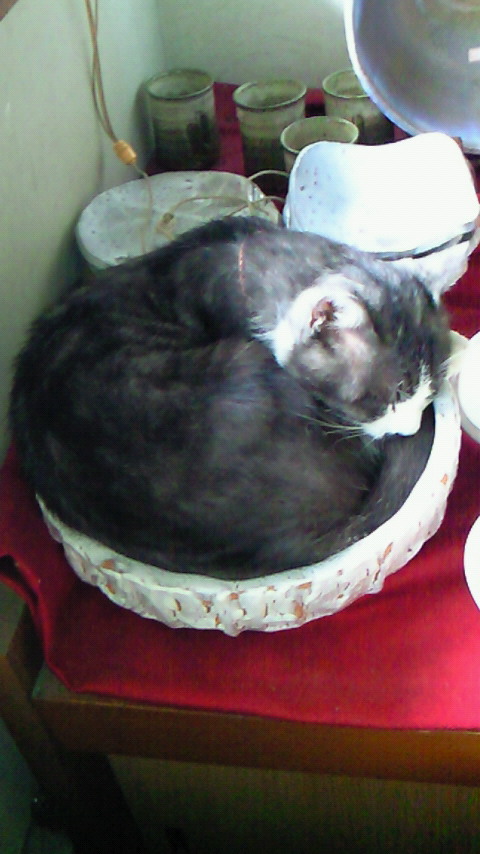 城下町の、駐車場の売店に、野良猫の、小太郎君が居るんだけど、今日は雨の為か、お店の中の、萩焼きの大皿の中で、お昼寝中~でした(≧▼≦)その姿が、可愛いのなんのって\(^O^)/思わず写メしました。